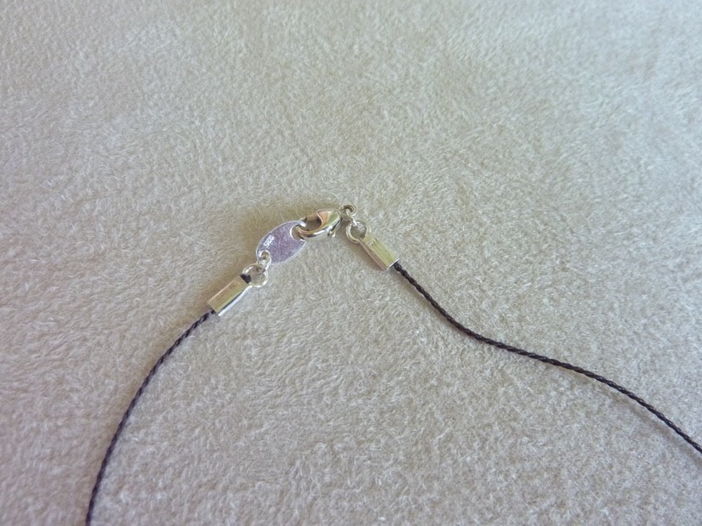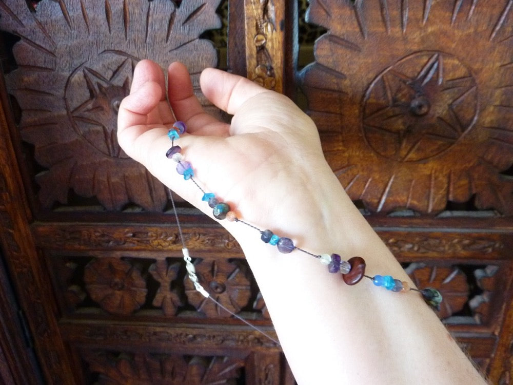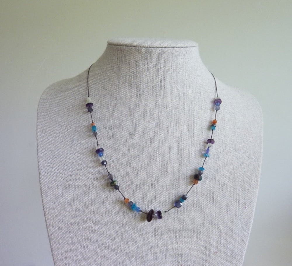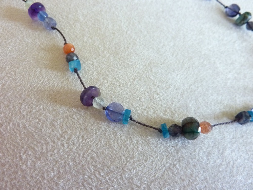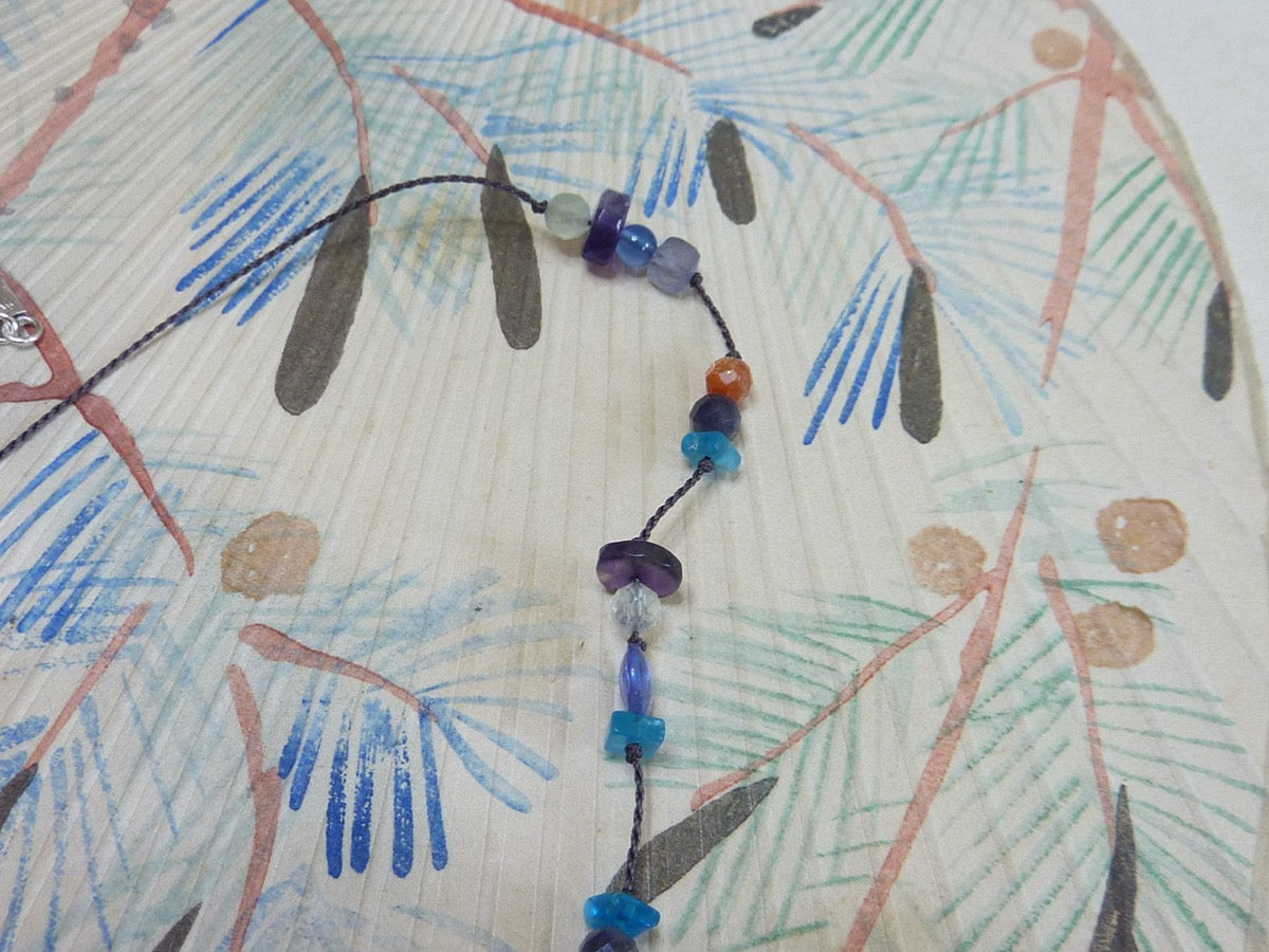Délicat collier de fines pierres semi-précieuses nouées le long d'un fil de soie gris anthracite.