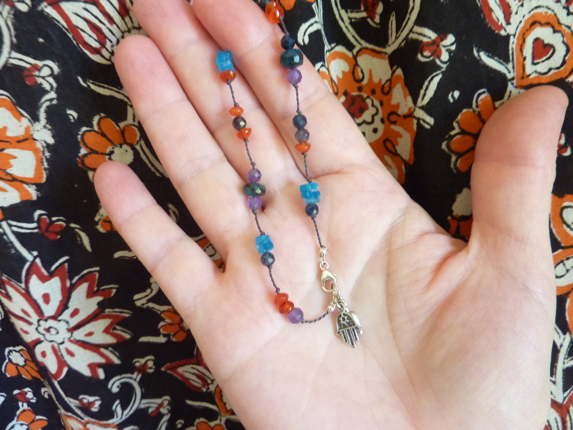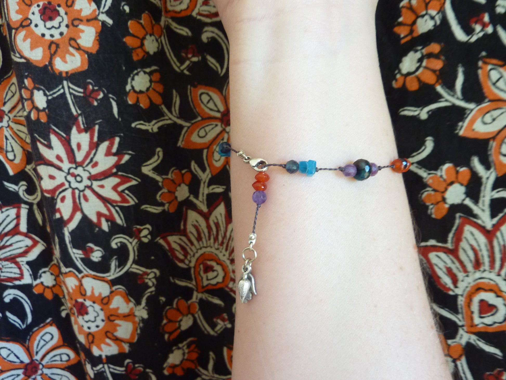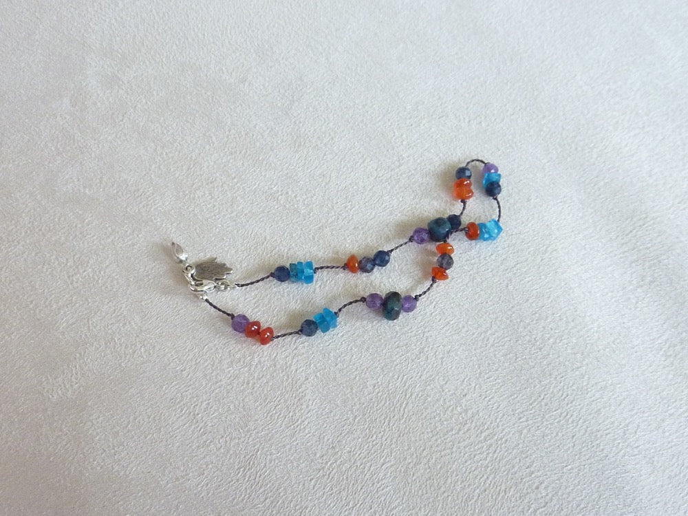 Cornaline, iolite cordiérite, améthyste, rondelles de chrysocolle, heishi d'apatite bleue, calcédoine nuit (teintée). Fermoir homard en argent 925, breloques plaqué argent.