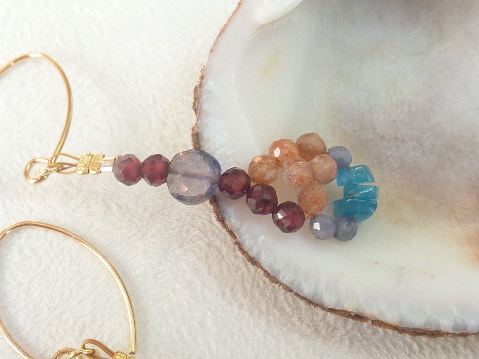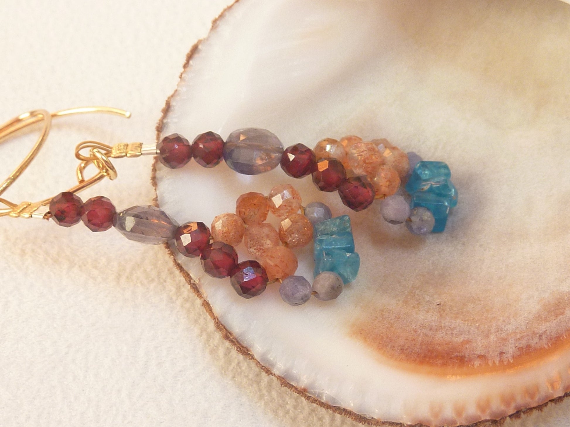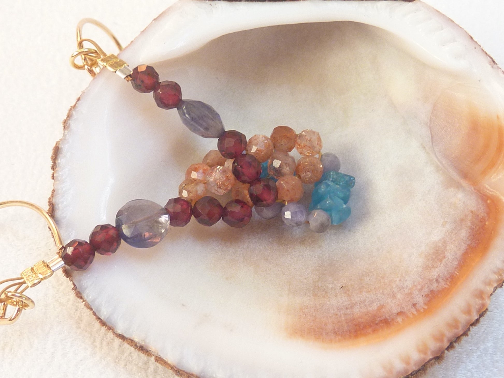 Délicates et scintillantes, ces boucles pendantes sont faites de très belles pierres semi-précieuses à facettes entrelacées dans une harmonie de bleus, rouge bordeaux et orangé. L'association de ces pierres magnifiques apporte beaucoup de grâce et une touche de mystère.