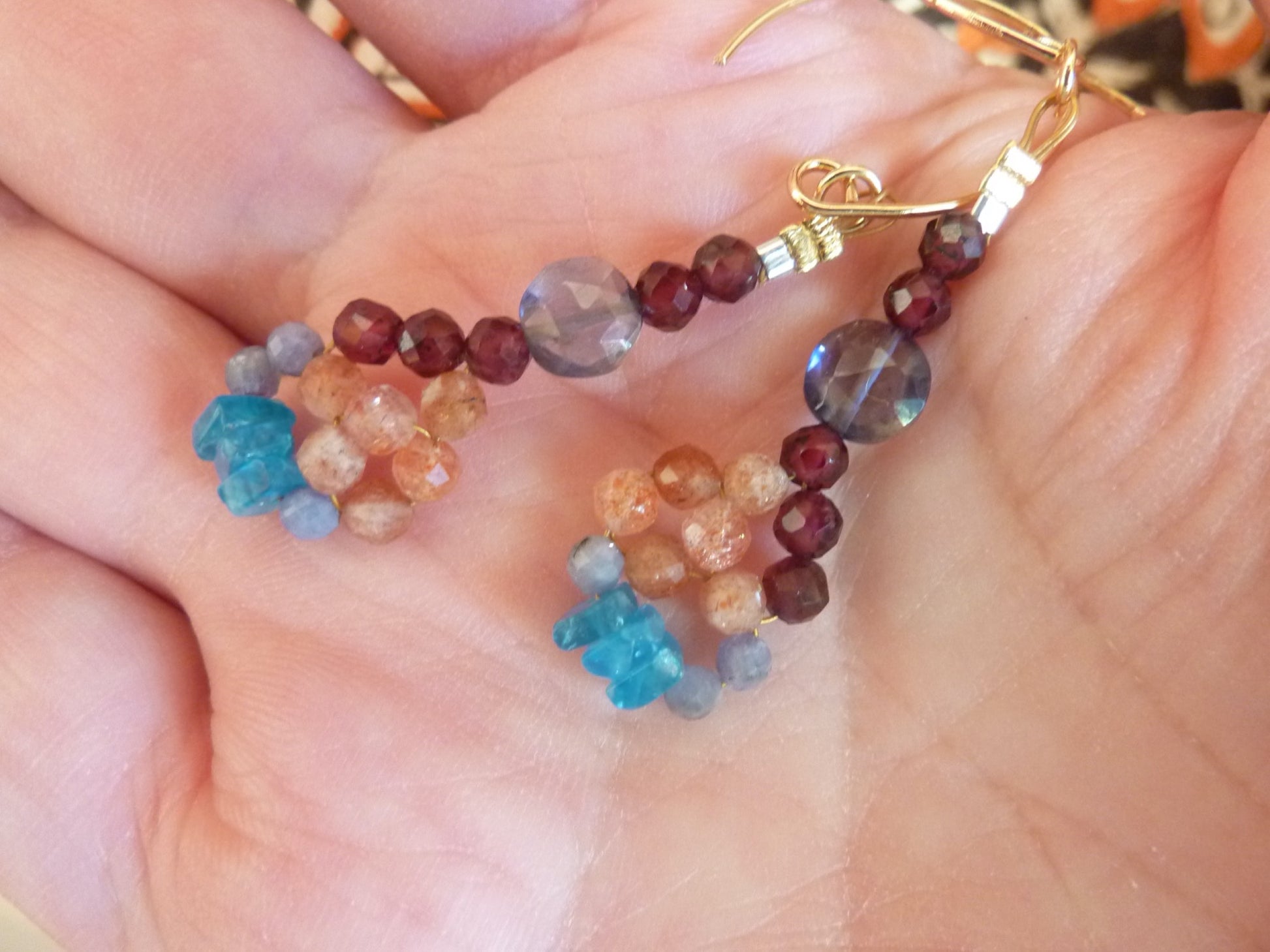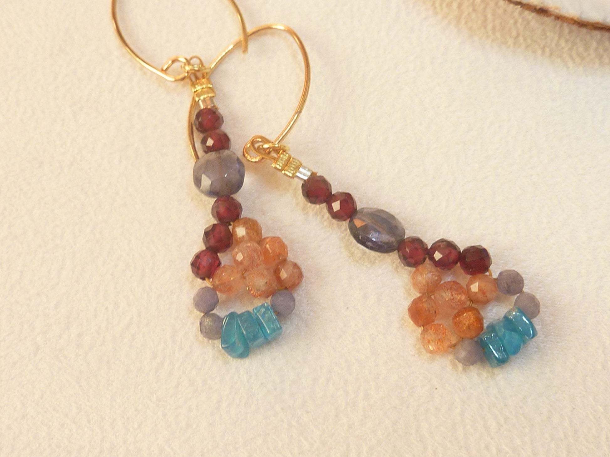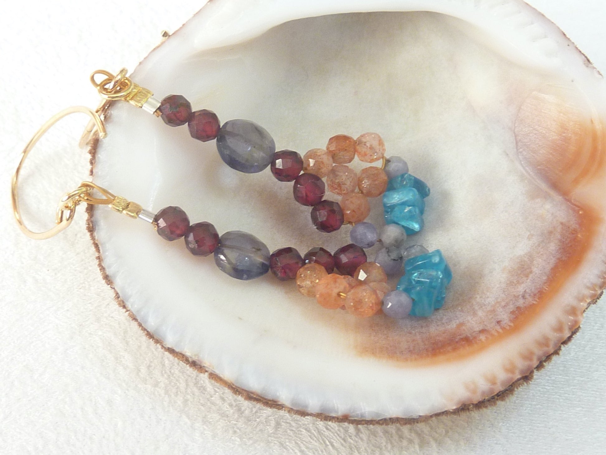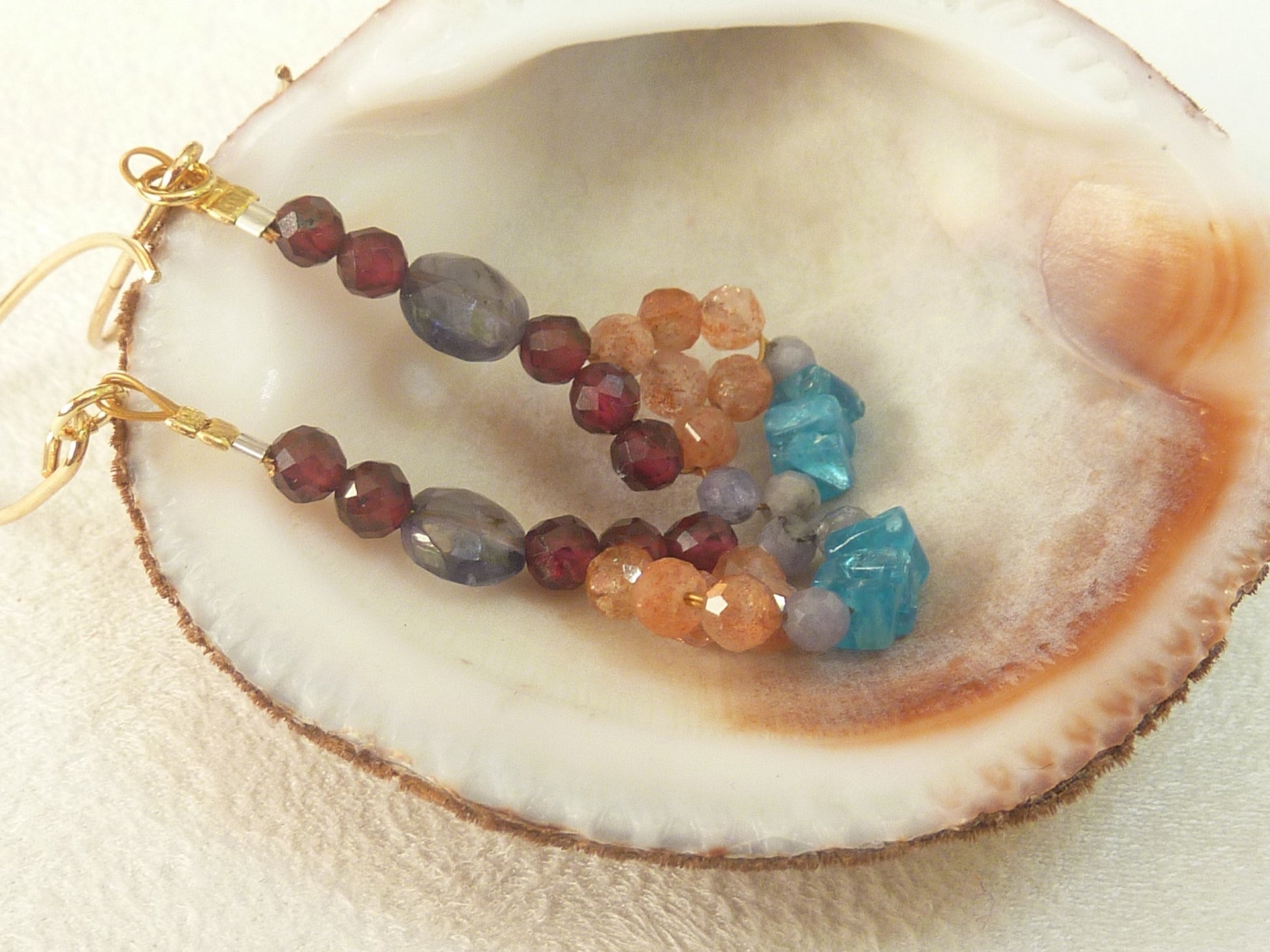 Délicates et scintillantes, ces boucles pendantes sont faites de très belles pierres semi-précieuses à facettes entrelacées dans une harmonie de bleus, rouge bordeaux et orangé. L'association de ces pierres magnifiques apporte beaucoup de grâce et une touche de mystère.