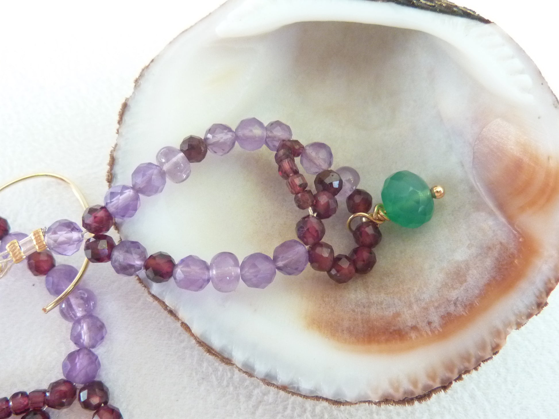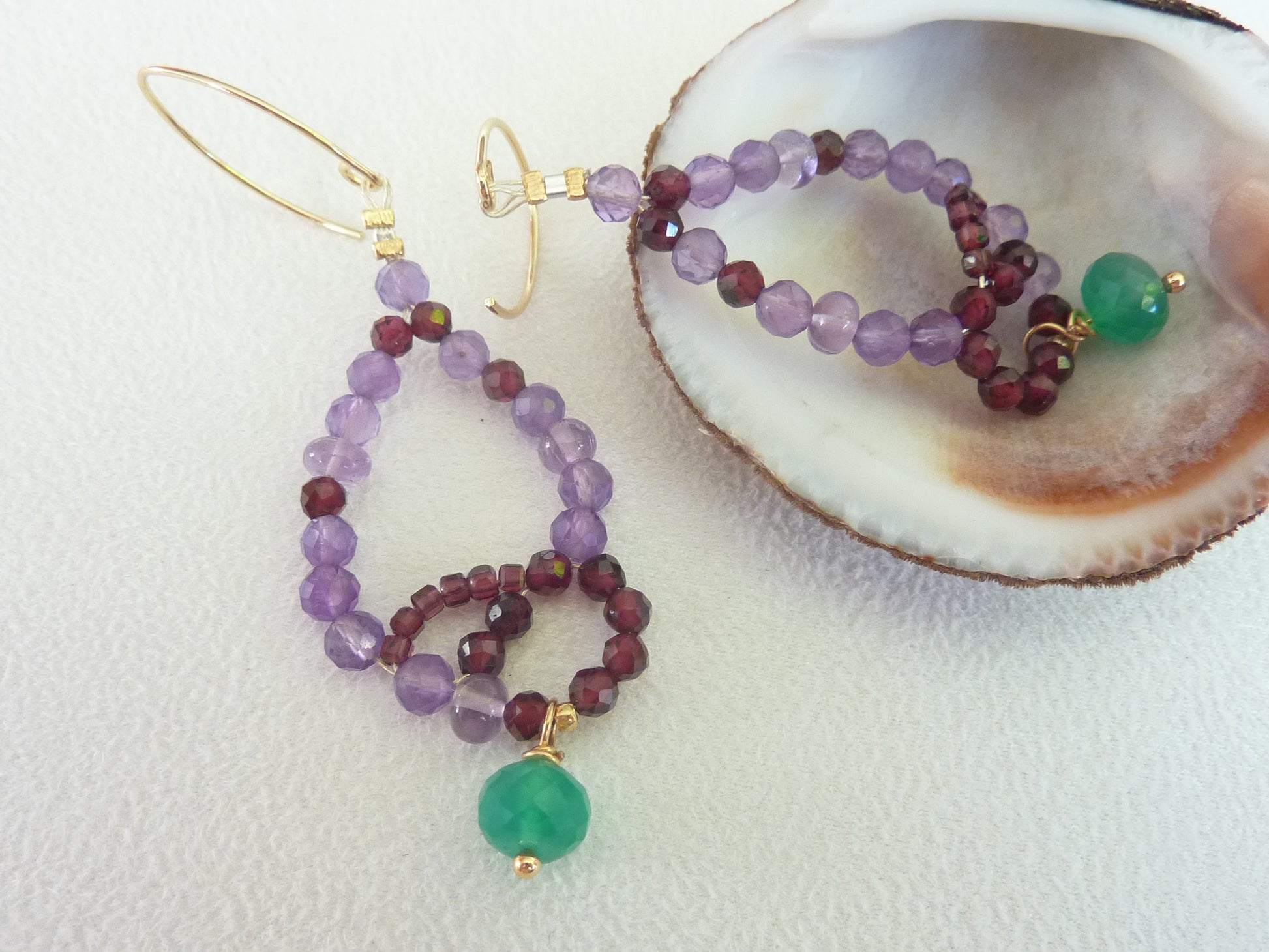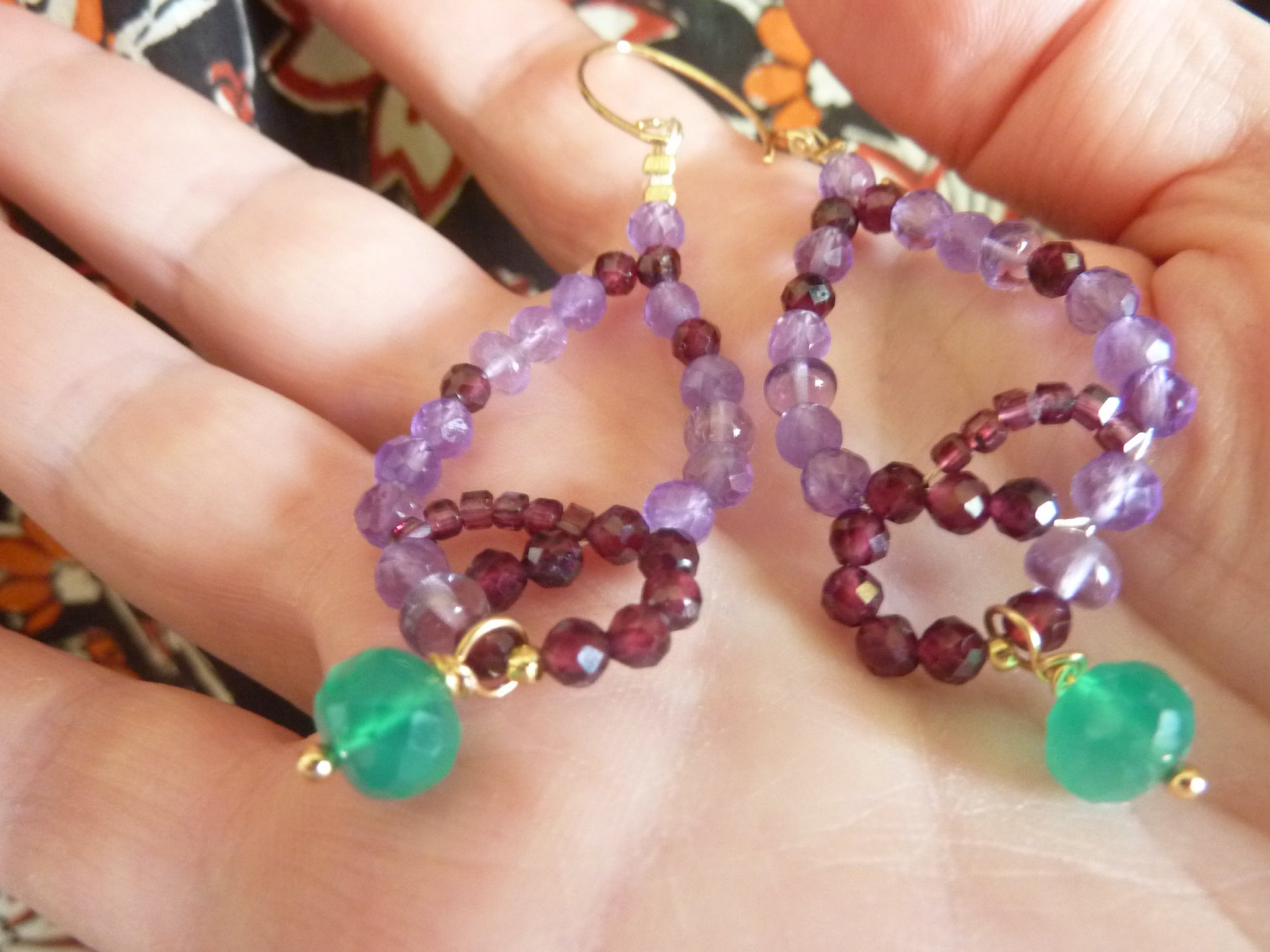 Créées à la main avec beaucoup patience et de passion, et de très belles perles d'améthyste lavande, d'améthyste à facettes, de grenat rouge éclatants et de l'onyx vert (teinté).