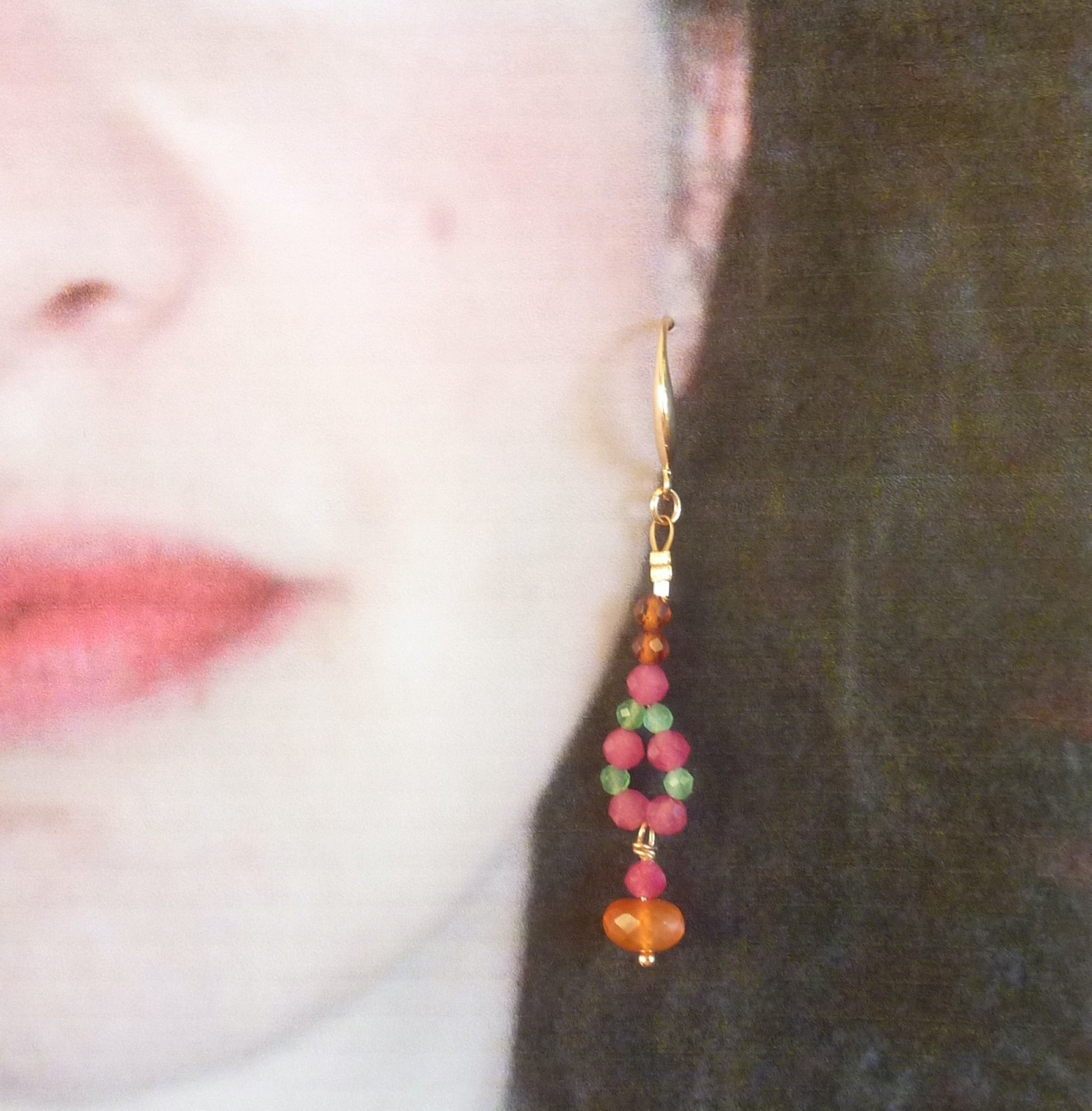 Délicates boucles de pierres gemmes aux belles couleurs vives : tourmaline rose, aventurine verte, grenat hessonite et breloques de cornaline d'un magnifique orange intense, qui illuminent le visage.