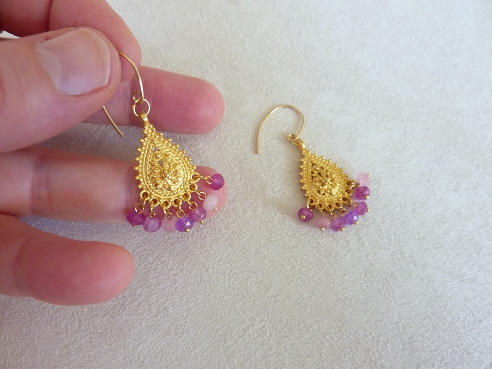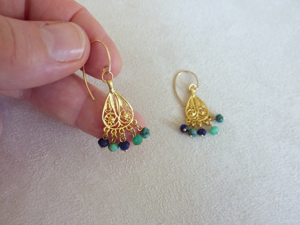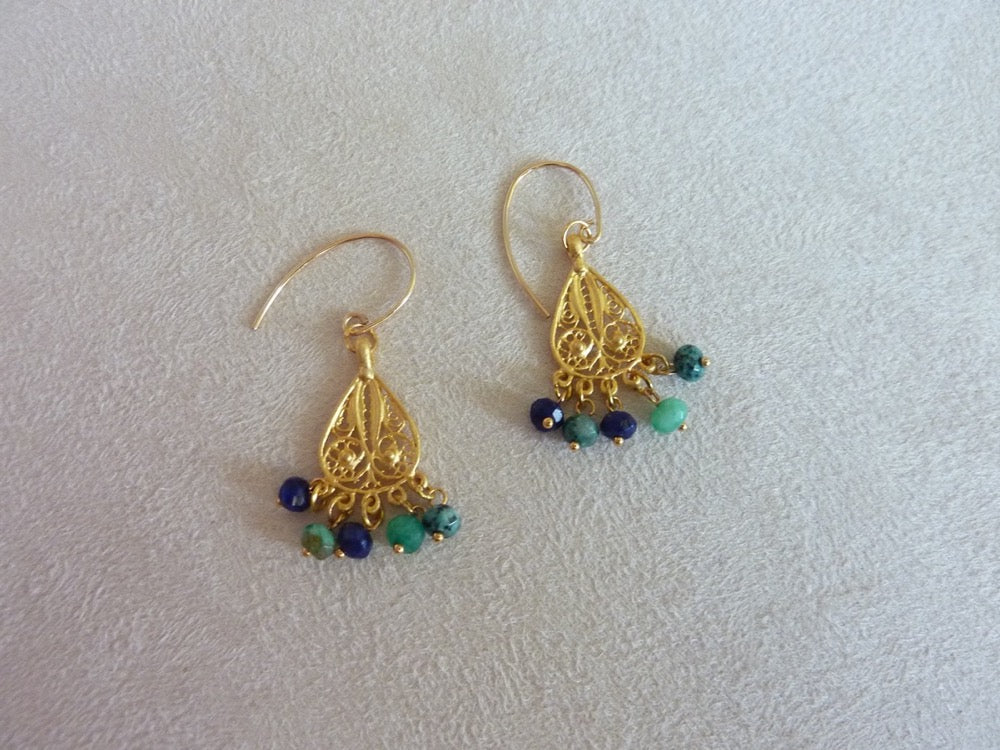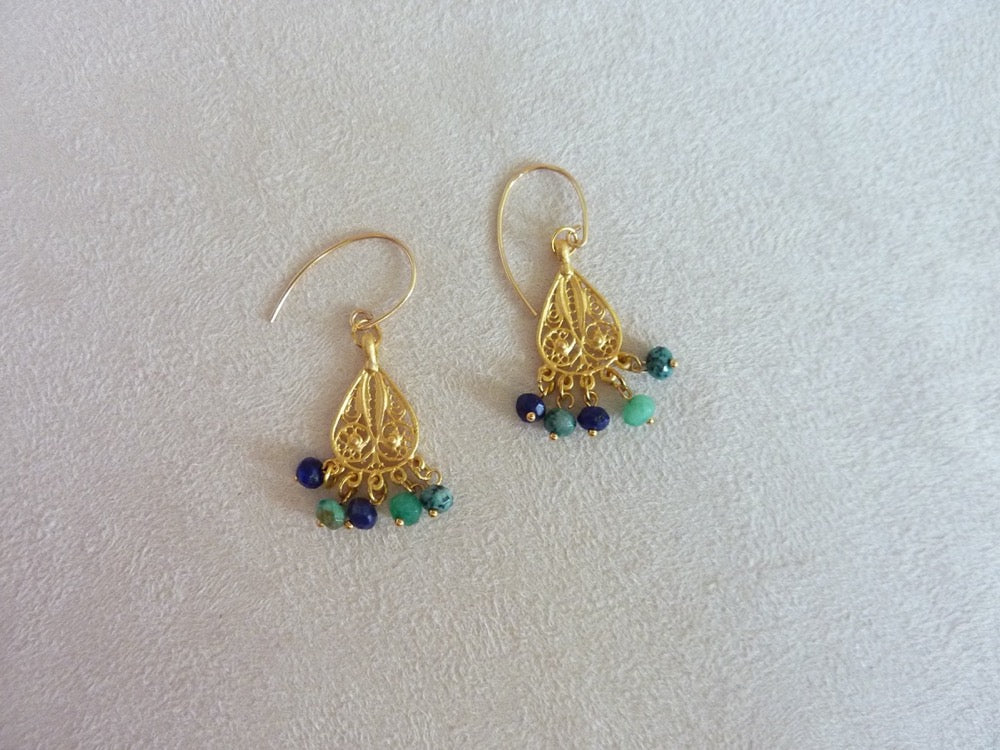 Légères boucles d'oreilles gouttes filigrane d'inspiration orientale à pampilles de pierres semi-précieuses.