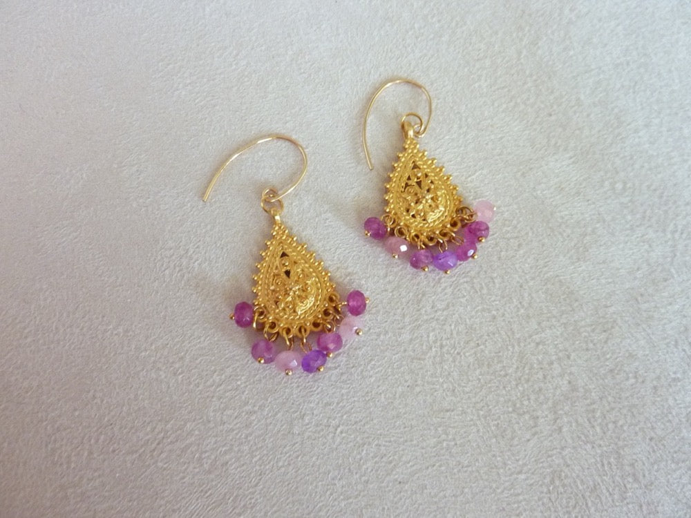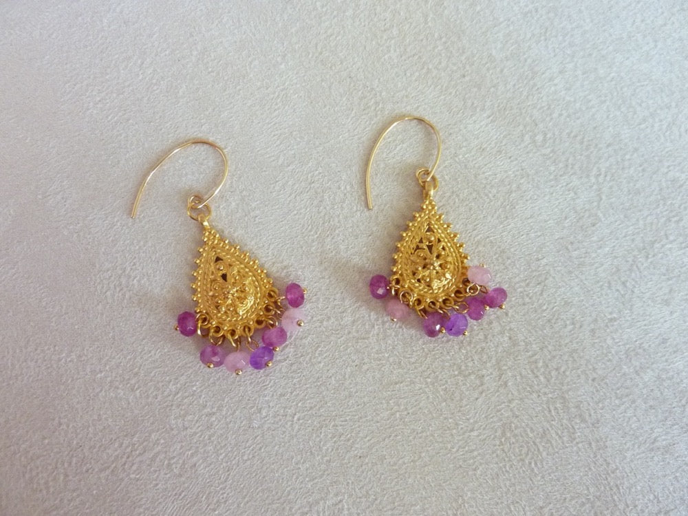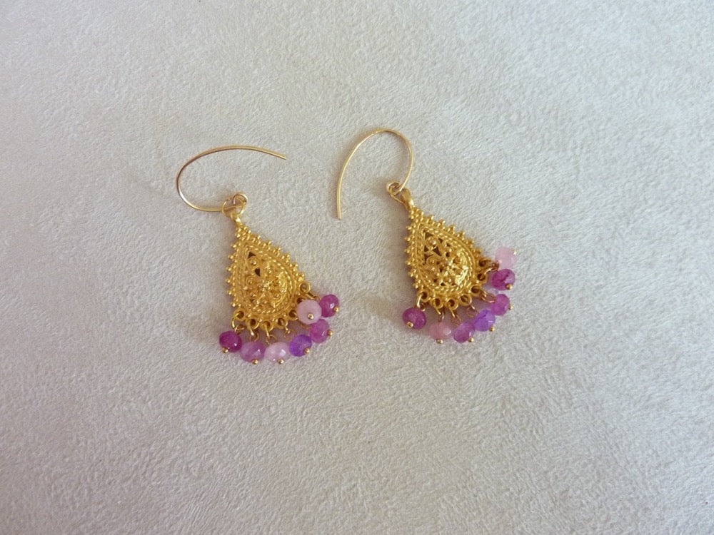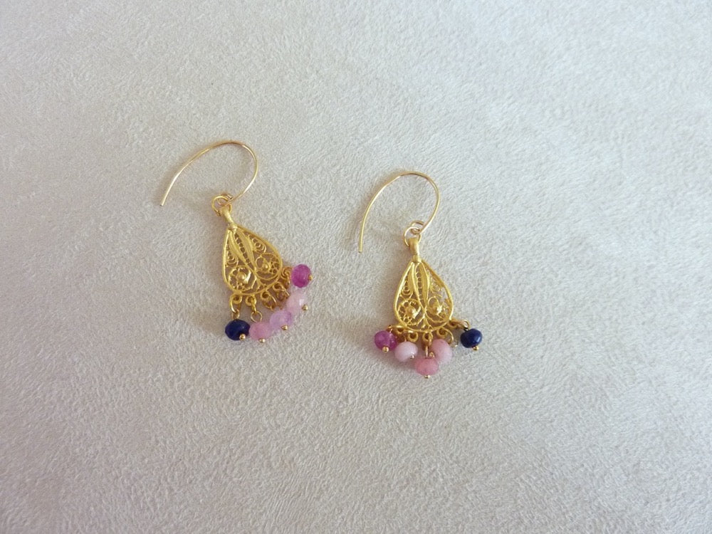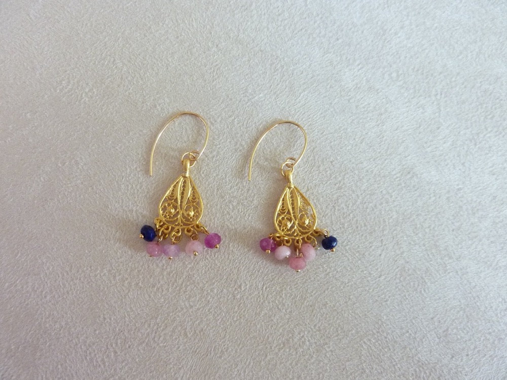 Légères boucles d'oreilles gouttes filigrane d'inspiration orientale à pampilles de pierres semi-précieuses.
